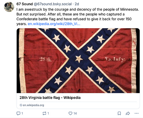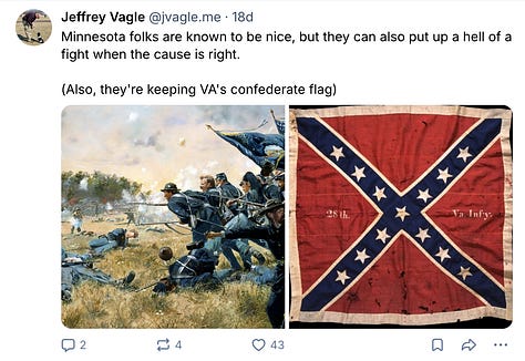 As a Virginian and recovering lost-causer, I say to Minnesota - KEEP THAT FLAG!!! I’m going to email Governor Walz right now, attach Kevin’s excellent article, and beseech the Governor to bring out the flag for the encouragement of his state in their current struggle.