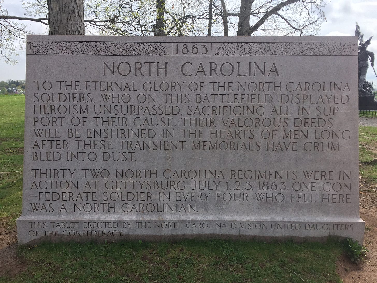 The accompanying large plaque situates the monument within the Lost Cause tradition by referencing the “heroism,” “glory” as well as the “sacrifice” of the North Carolinians during the 3-day battle. It offers a very helpful reminder of the important difference between history and memory.