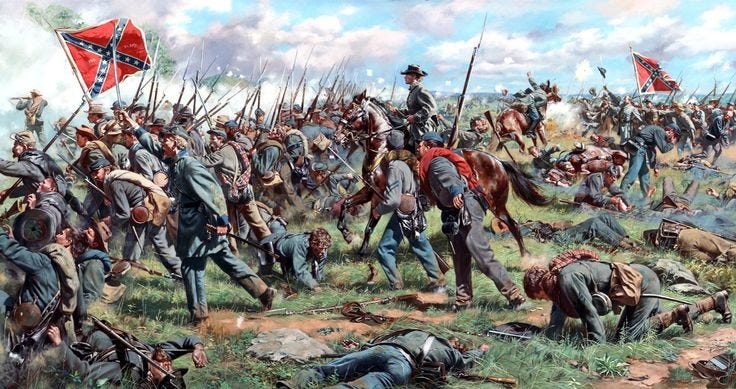 Regarding the painting you shared. The area where the rebels are standing looks so flat. Until I stood at the Virginia monument and looked east toward the Meade monument, I’d not realized how literally uphill the Pickett-Pettigrew assault was. I understand the Federal soldiers were chanting “Fredericksburg! Fredericksburg!” The rebels only charged once and gave it up as a bad job. I wonder how the percentage of KIA and wounded compare in those two actions.