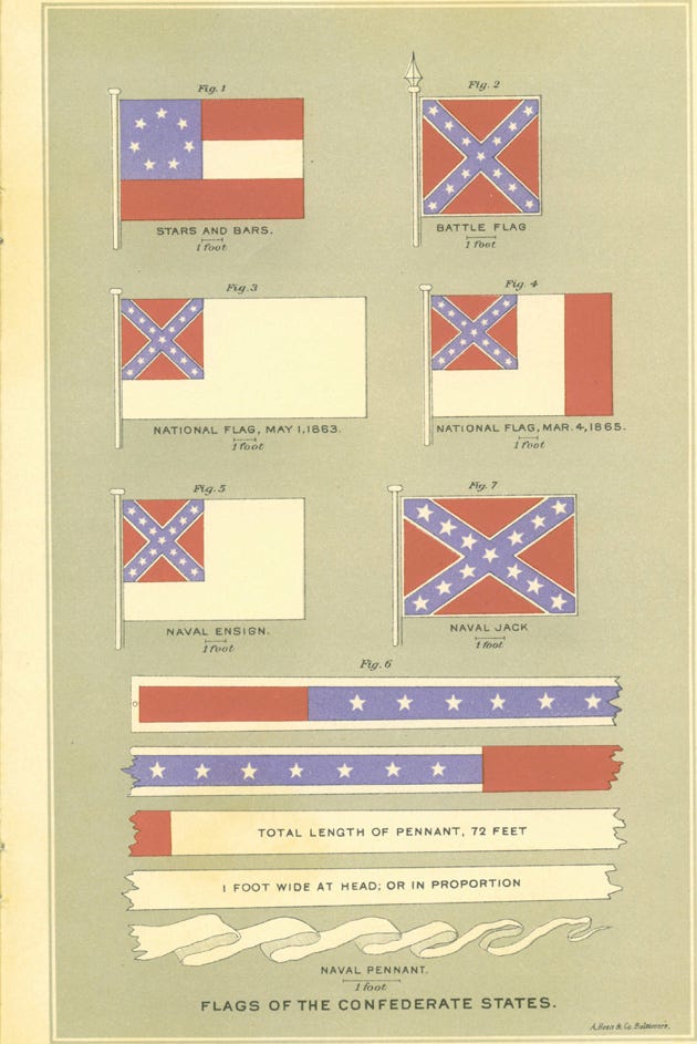 There were many Confederate flags adopted by the government and the military between 1861 and 1865. This chart is helpful, though by no means inclusive. You can see the First National at the top left and in the second row you will see the additional two national flags adopted by the Confederate government during the second half of the war.