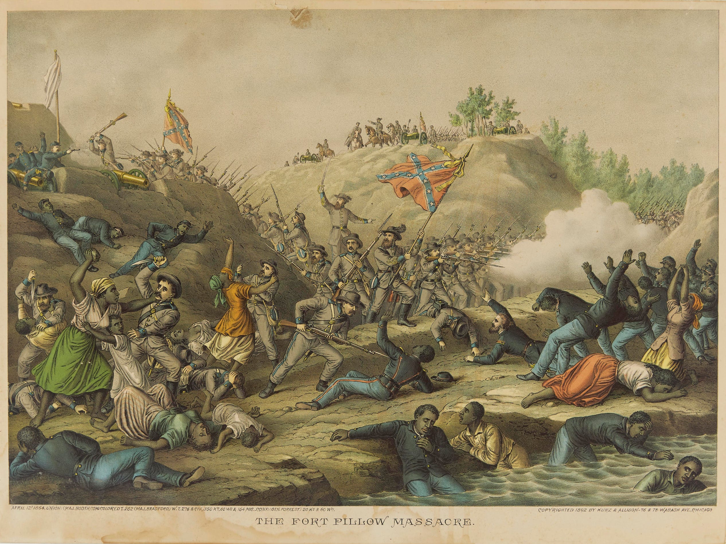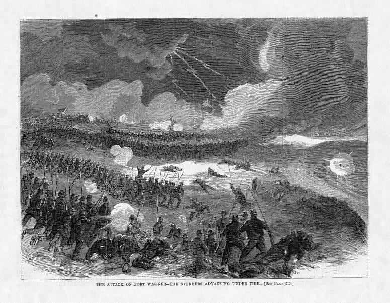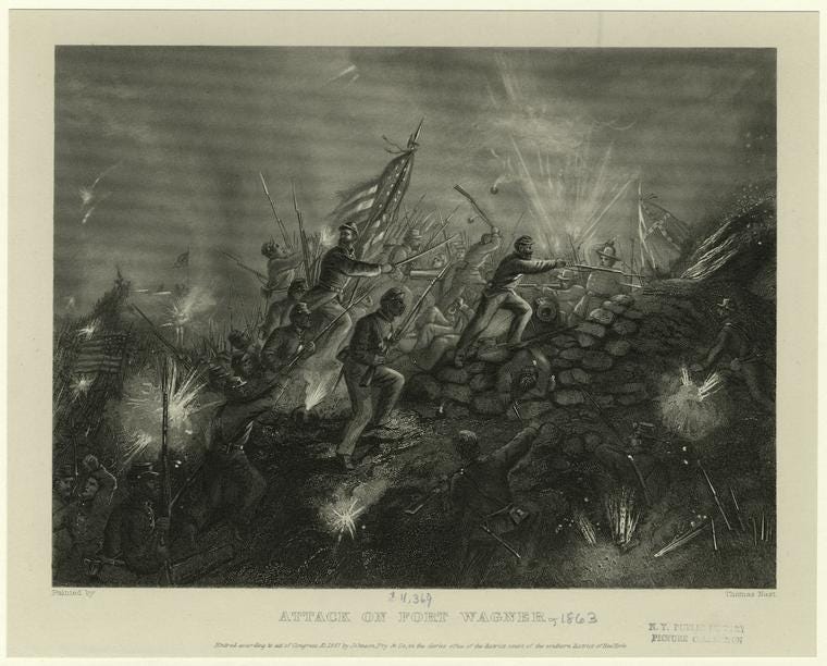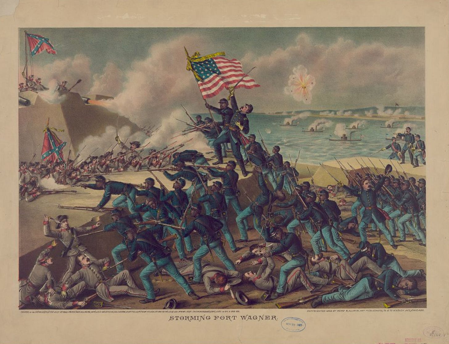 In 1890, the Chicago-based print maker Kurz & Allison released the colored lithograph “Storming Fort Wagner.” The choice to inaccurately depict the assault on Fort Wagner as taking place in full daylight allowed the illustrator to more clearly depict details such as soldiers wrestling one another to the ground and Black soldiers plunging their bayonets into the chests of Confederate soldiers.
