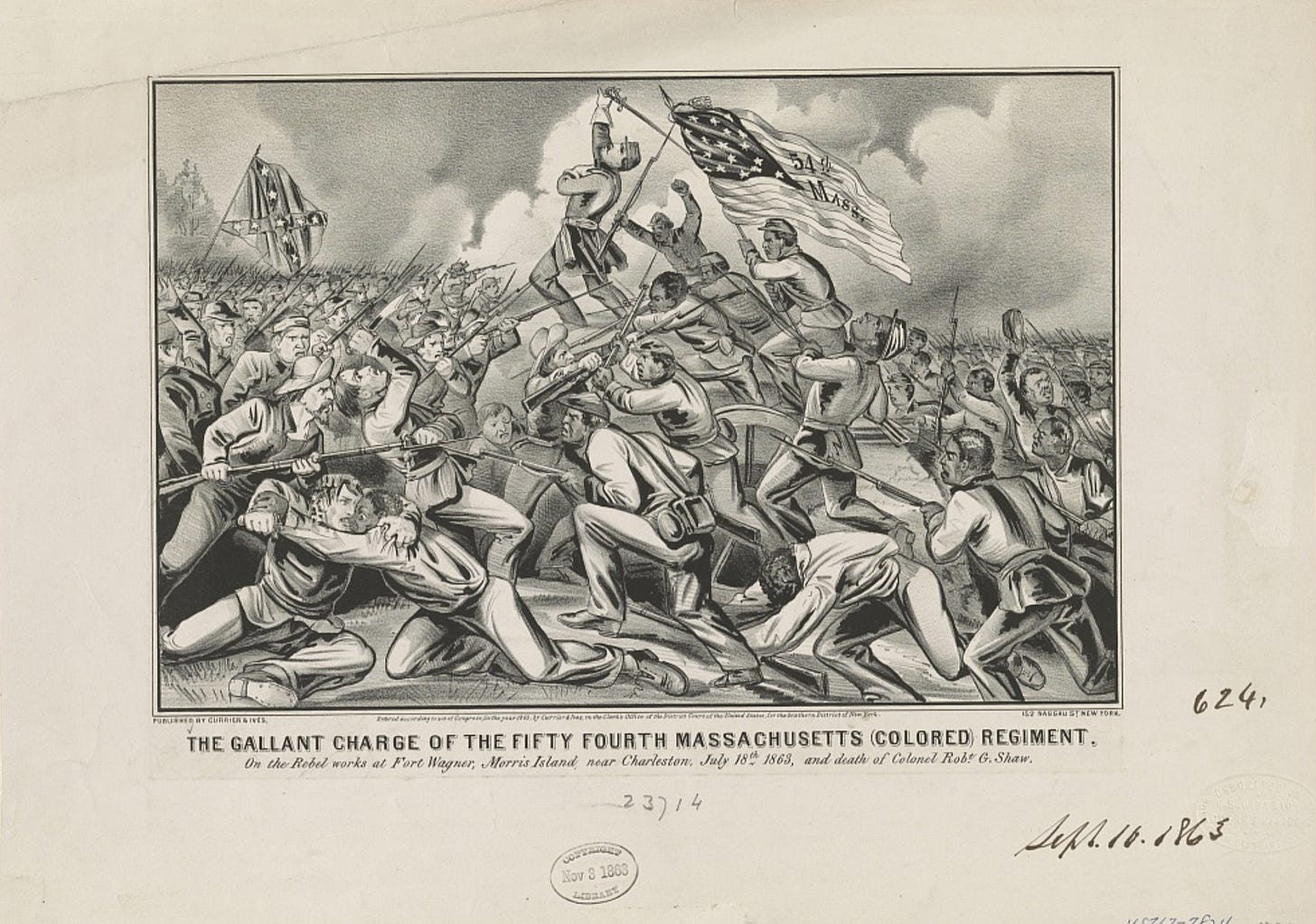 Shortly thereafter, “The Gallant Charge of the 54th Massachusetts (Colored) Regiment,” from Currier & Ives was released with its focus on Shaw and the national flag at center surrounded by his men and poised to breach Fort Wagner’s defensive walls. This served as the foundation for future prints.