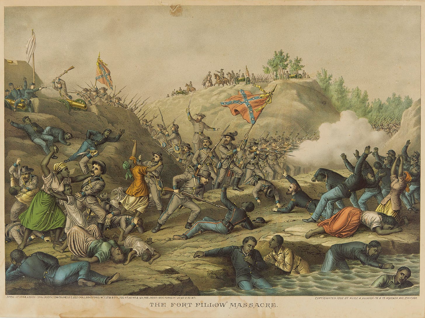 The racialized nature of the fighting is vividly portrayed as it would be again, even more dramatically, with the release of The Fort Pillow Massacre in 1892. The scene centers on the Confederate massacre of United States Colored Troops and defenseless Black civilians at Fort Pillow, Tennessee on April 12, 1864. It should be noted that there is little evidence that Black civilians were massacred.