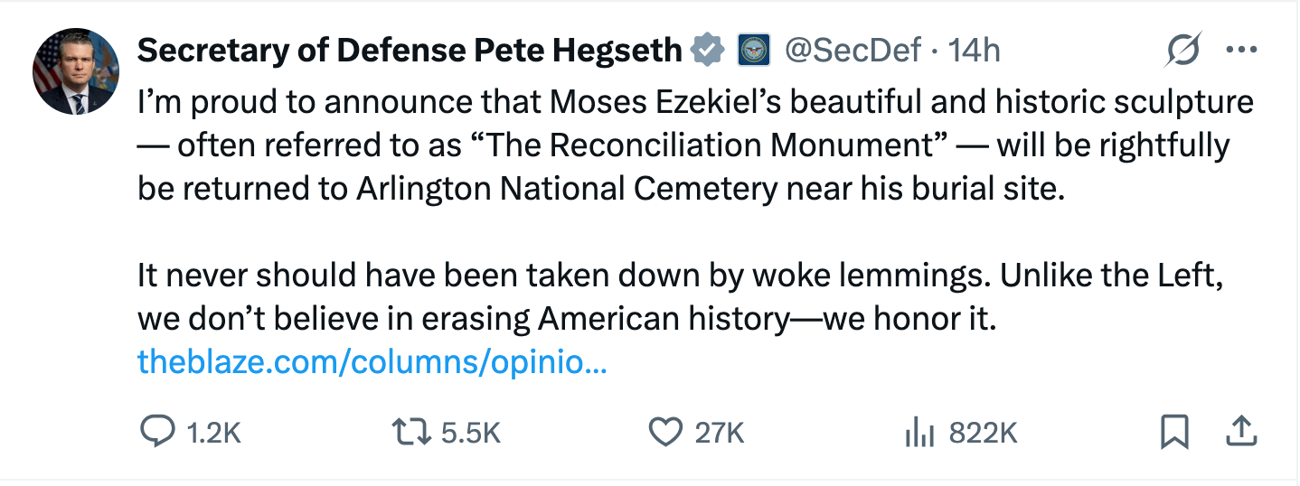 A number of things are worth pointing out about Hegseth’s tweet. First, notice that he never refers to a Confederate monument or the Confederacy. Anyone unfamiliar with the identity of this monument would have no idea what he is referring to. It suggests that the defense secretary understands just how controversial his announcement is and also reveals his embarrassment in failing to refer to it as such.