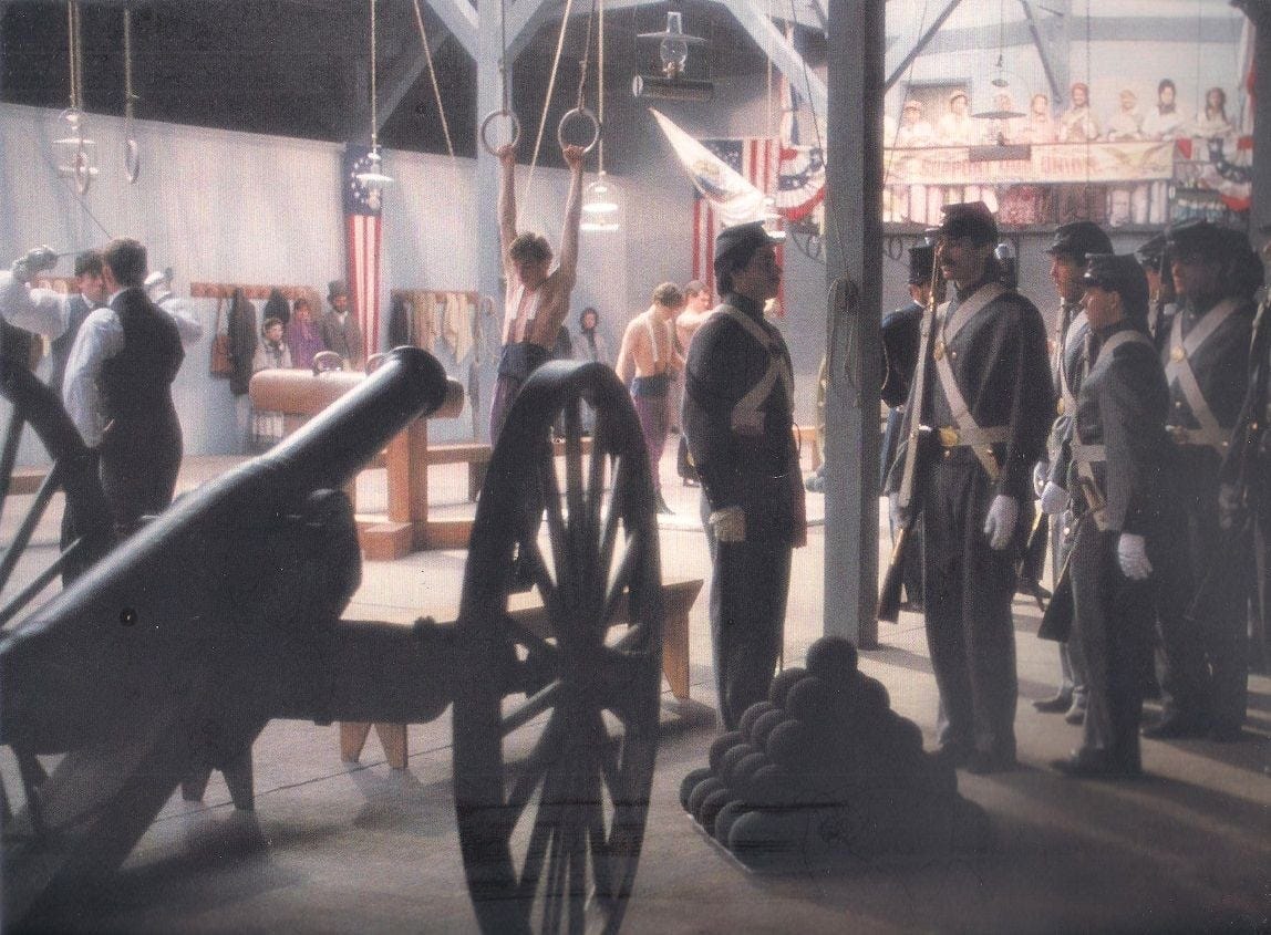 How many of you know that a scene depicting Robert Gould Shaw with the Seventh New York was filmed for the movie Glory, but was eventually cut? Here is a photograph of the unit working out in a New York armory in 1861. You can see Matthew Broderick standing at attention to the right of the cannon.