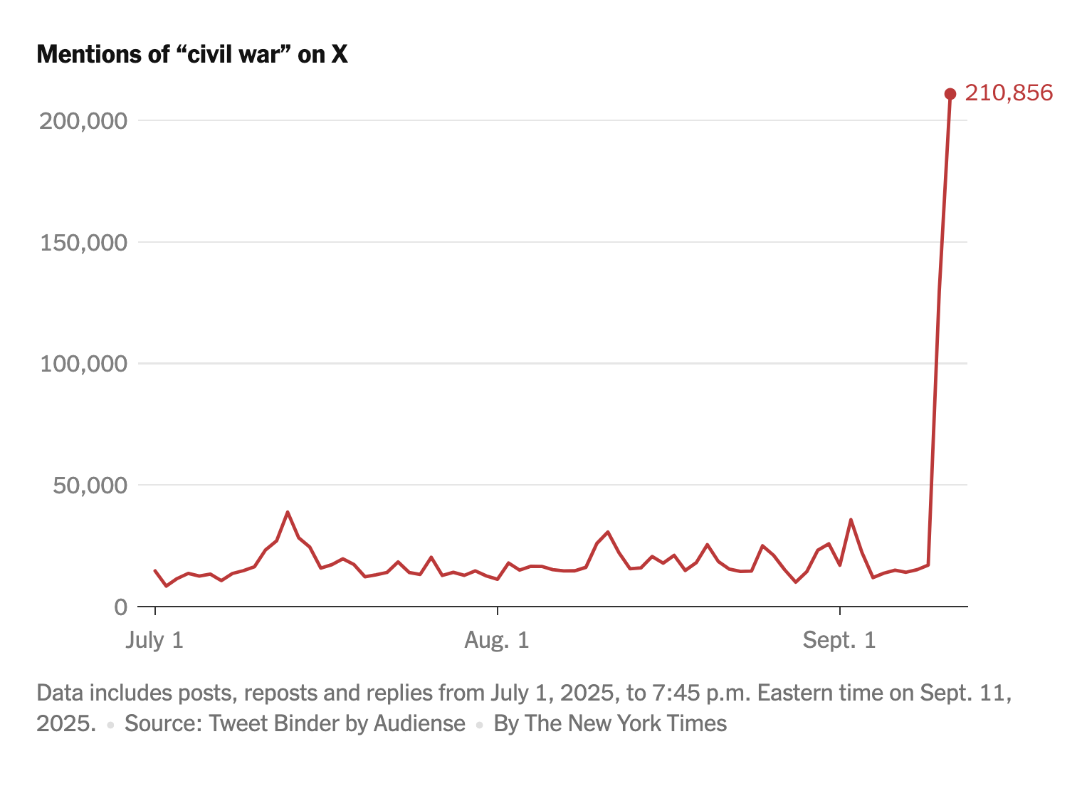 Earlier this week, The New York Times reported a surge in references to “Civil War” on social media following the assassination of Charlie Kirk. The piece fit into what has become a predictable response to just about every act of political violence over the past two decades.